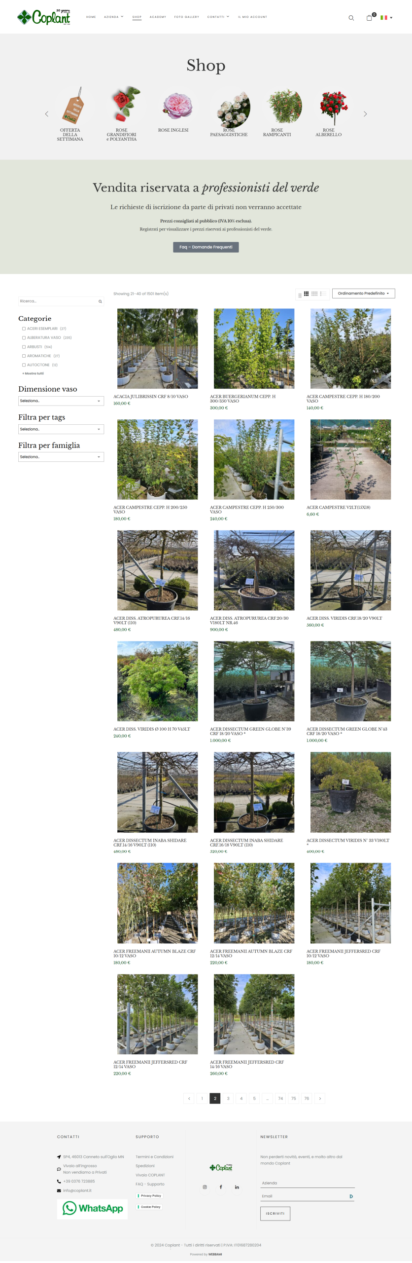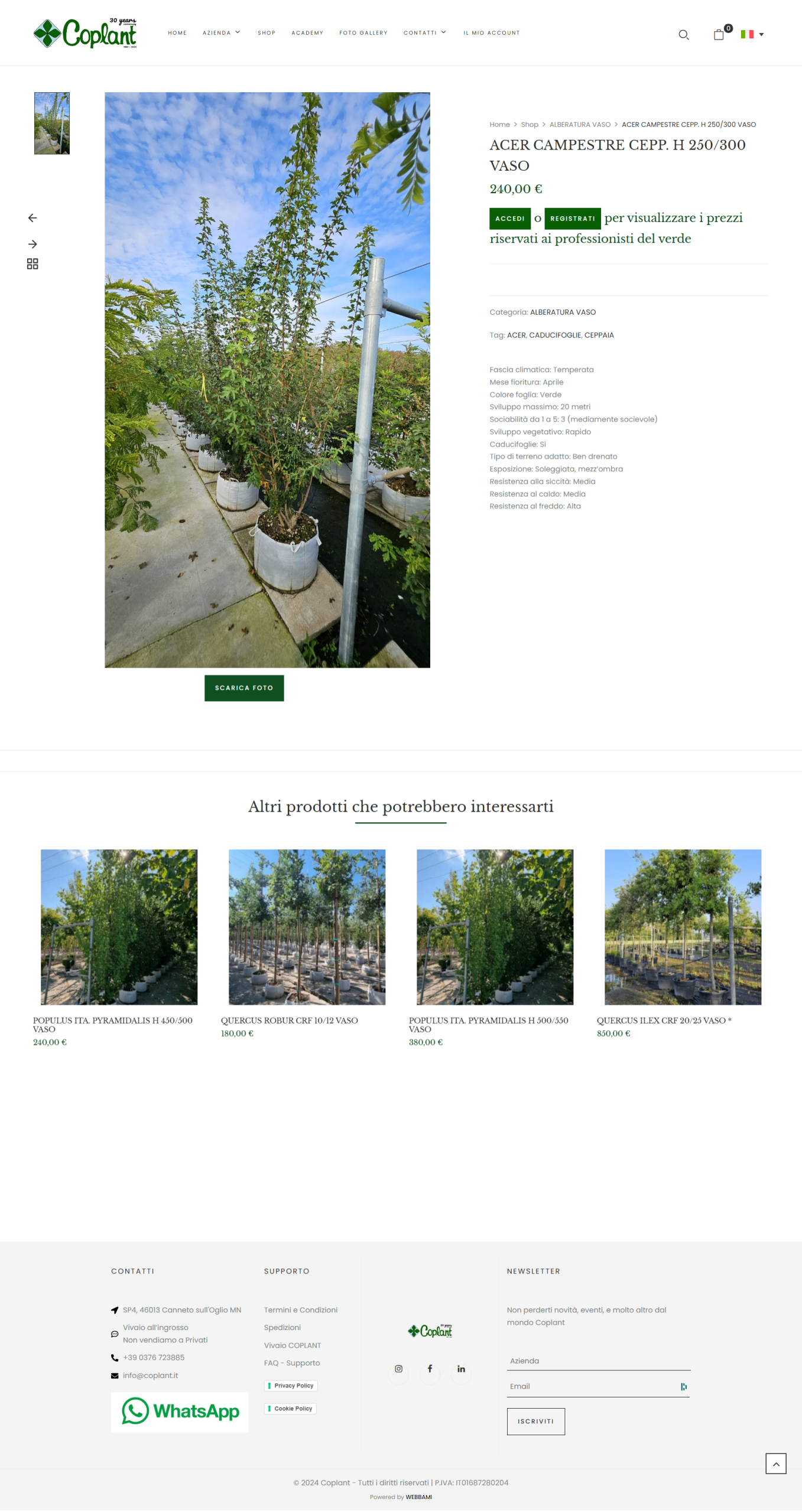 Fondata ufficialmente nel 1993 ma con radici che risalgono al 1978, Coplant si distingue per la produzione di alberi, arbusti e piante ornamentali su oltre 100 ettari, di cui 70 in pieno campo e 30 dedicati alla vasetteria. Il sito è stato strutturato per presentare l’intero catalogo — tra cui alberature, conifere, piante da frutto, erbacee perenni, rose e arbusti forestali — in modo chiaro e facilmente navigabile.